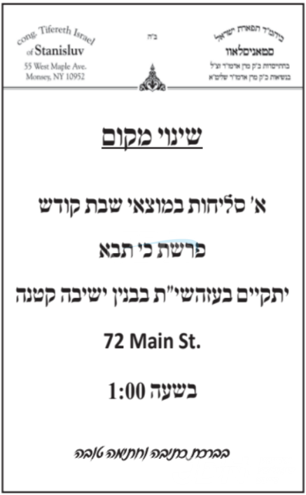 כ"ק אדמו"ר מסטאניסלאוו שליט"א וועט דעם מוצאי שבת זאגן סליחות ברוב עם הדרת מלך, אין היכל ישיבה קטנה תפארת ישראל סטאניסלאוו אויף מעין סטריט אין מאנסי.