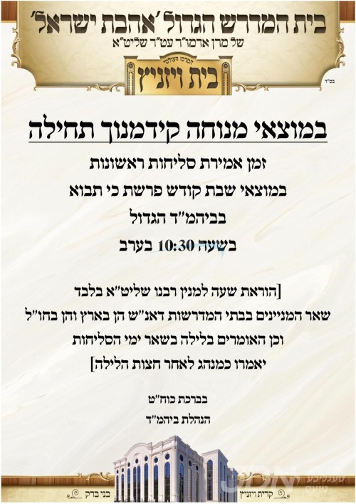 כ"ק אדמו"ר מוויזניץ שליט"א פון בית שמש וועט אנקומען מוצאי שבת קודש קיין בני ברק, אויף אמירת סליחות הראשונות בבית מדרשו אויף רחוב מלצר אין בני ברק.