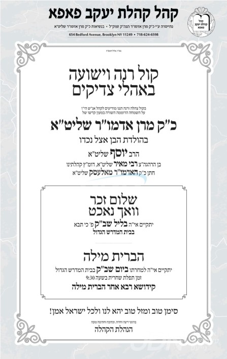 דעם שבת קומט פאר די שמחת הברית פון א אור אייניקל ביי כ"ק אדמו"ר מפאפא שליט"א, אייניקל פון בנו הגדול הגה"צ ר' מאיר גרינוואלד שליט"א דומ"ץ פאפא, בן הנולד ביי זיין זון הרב יוסף גרינוואלד שליט"א, איידעם ביי כ"ק אדמו"ר מאלעסק שליט"א פון וויליאמסבורג. – די שמחה קומט פאר אין ביהמ"ד הגדול פאפא אין וויליאמסבורג.