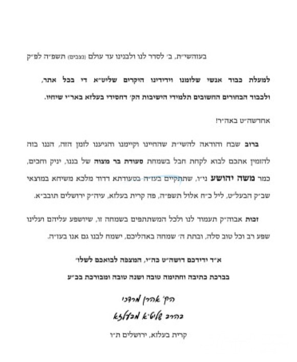 שמחת בית בעלזא: דעם מוצאי שבת קומט פאר די שמחת הבר מצוה פון א אייניקל ביי כ"ק אדמו"ר מבעלזא שליט"א, הב' משה יהושע נ"י זון פון בנו יחידו הגה"צ ר' אהרן מרדכי רוקח שליט"א, איידעם ביי כ"ק גאב"ד מאקאווא שליט"א. – די שמחה קומט פאר אין ביהמ"ד הגדול אין קרית בעלזא ירושלים.