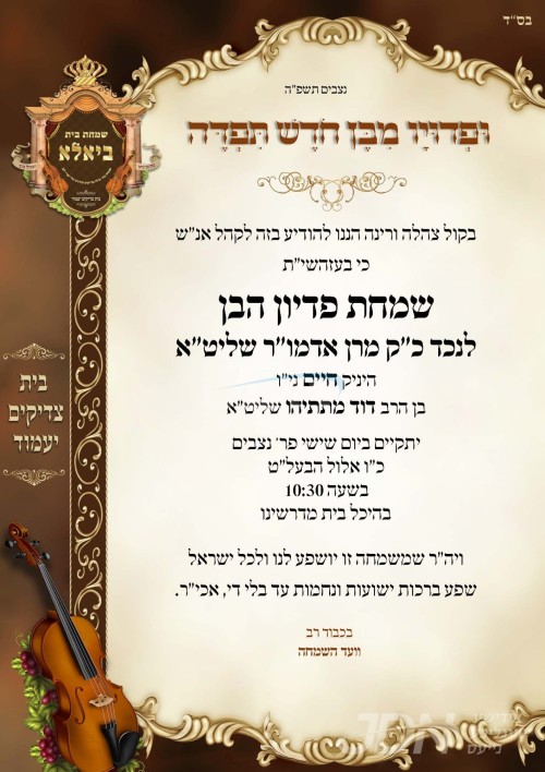היינט קומט פאר די שמחת פדיון הבן פון א אייניקל ביי כ"ק אדמו"ר מביאלא בית שמש שליט"א, בן הנולד ביי זיין זון הרב דוד מתתיהו ראבינאוויטש שליט"א, איידעם ביי כ"ק אדמו"ר מליעזש ראדוואן שליט"א. – די שמחה קומט פאר אין ביהמ"ד ביאלא בית שמש.