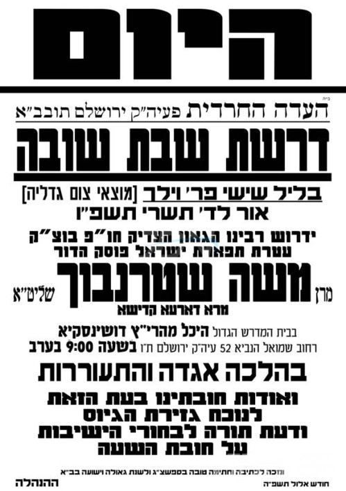 הגאון הגדול פוסק הדור מרא דארעא קדישא שליט"א וועט היינט אויפדערנאכט אויפטרעטן מיט די שבת שובה דרשה ברוב עם הדרת מלך, אין די נייע פראכטפולע ביהמ"ד הגדול היכל מהרי"ץ דושינסקיא אין ירושלים.