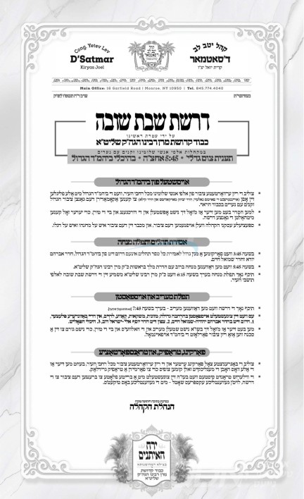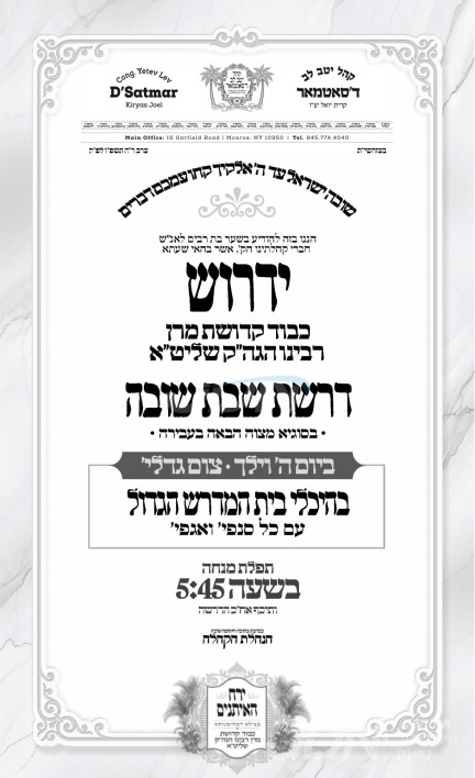 כ"ק אדמו"ר מסאטמאר שליט"א וועט היינט נאכמיטאג אויפטרעטן מיט די שבת שובה דרשה ברוב עם הדרת מלך, אין ביהמ"ד הגדול אין קרית יואל.