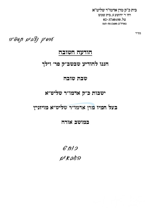 כ"ק אדמו"ר מוויזניץ שליט"א פון ירושלים וועלכער איז צוגאסט אין ארץ ישראל לרגל די ימים הנוראים, וועט פראווענען דעם שבת בבית מדרשו קהל תורת חיים וויזניץ אויף רחוב אדוניהו הכהן אין ירושלים עיה"ק.