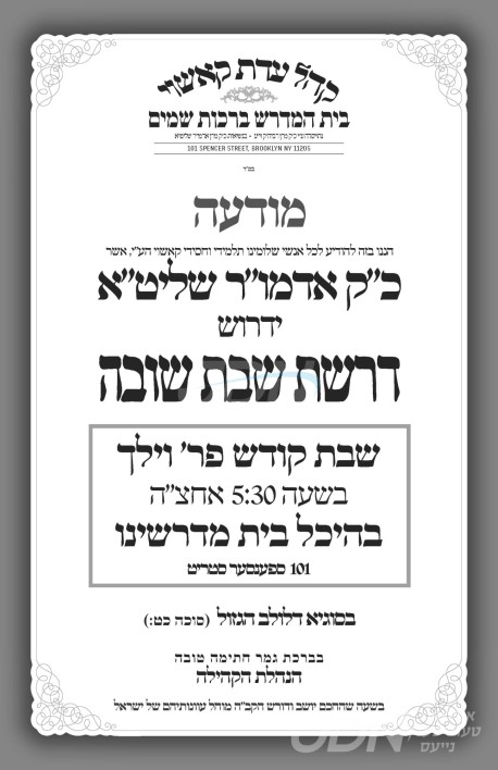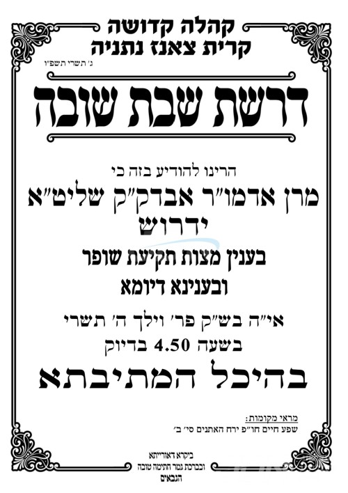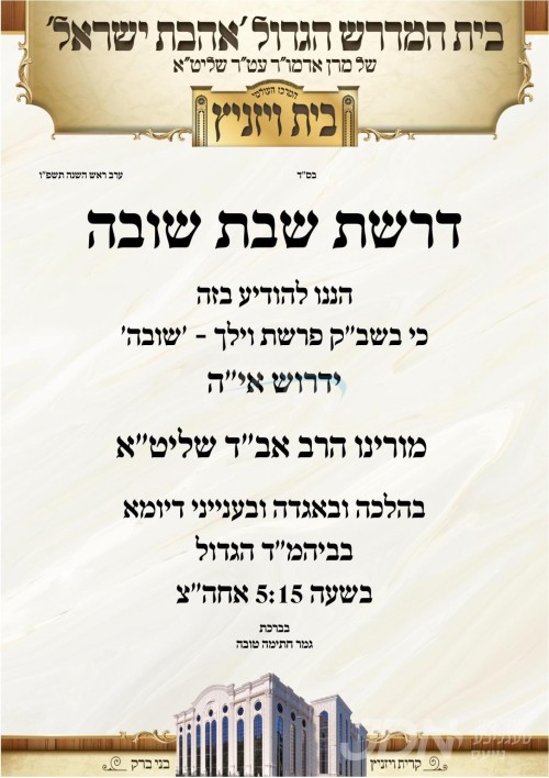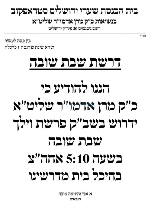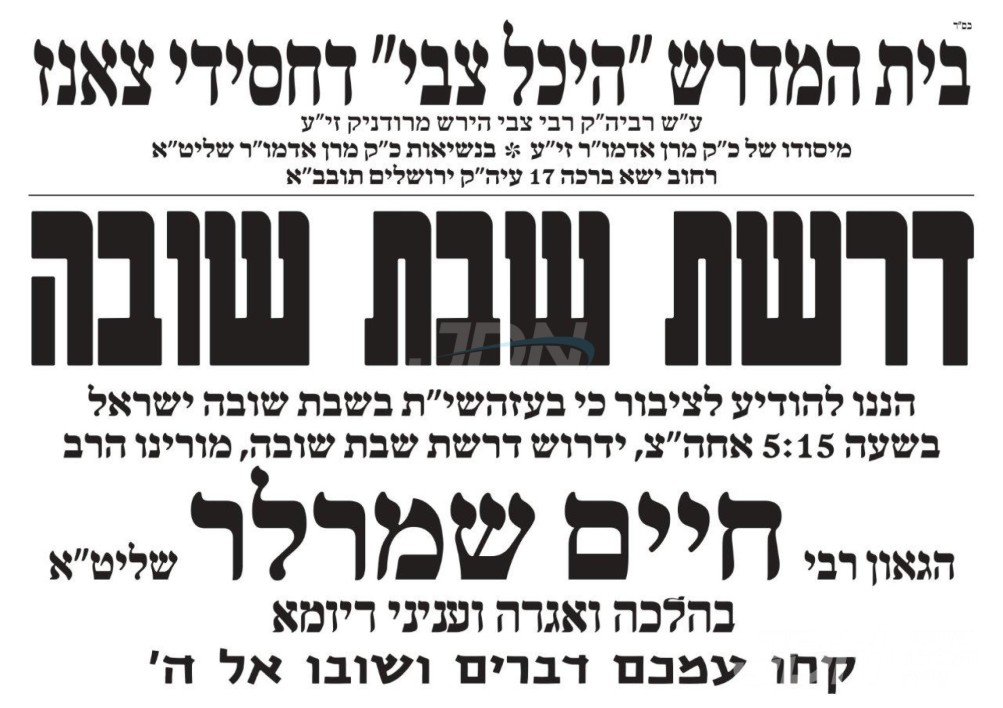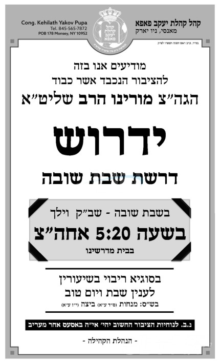 דעם שבת וילך שבת שובה וועלן פילע אדמורי"ם ורבנים אויפטרעטן מיט די דרשות שבת שובה כנהוג.
