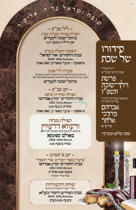 הגה"צ ר' אברהם מרדכי אלתר שליט"א אייניקל פון הרה"ק בעל פני מנחם מגור זי"ע, וועט פראווענען דעם שבת בקרב חברי ק"ק פני מנחם אין בארא פארק, די תפילות אין די שטיבלעך און ישיבה לצעירים, און שלש סעודות אויף א גרויסע פארנעם אין די ספינקא זאל אויף די זעקס און פופציגסטע סטריט.