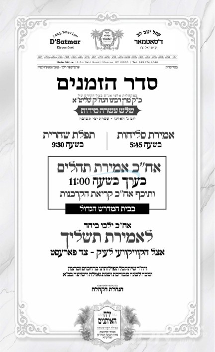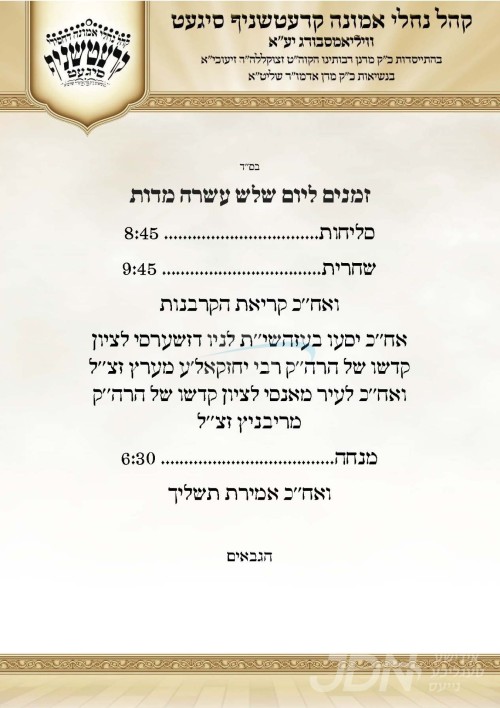 כ"ק אדמו"ר מקרעטשניף סיגעט וומס"ב שליט"א וועט היינט נאכמיטאג ארויספארן קיין ניו דזשערזי, צו פוקד זיין דעם ציון הק' פון זקינו הרה"ק רבי יחזקאל'ע מערץ זי"ע, און דערנאך קיין מאנסי צו מתפלל זיין ביים ציון הק' פון הרה"ק מריבניץ זי"ע.