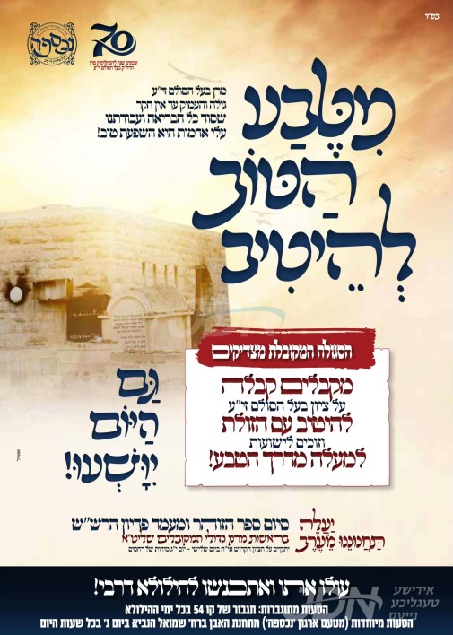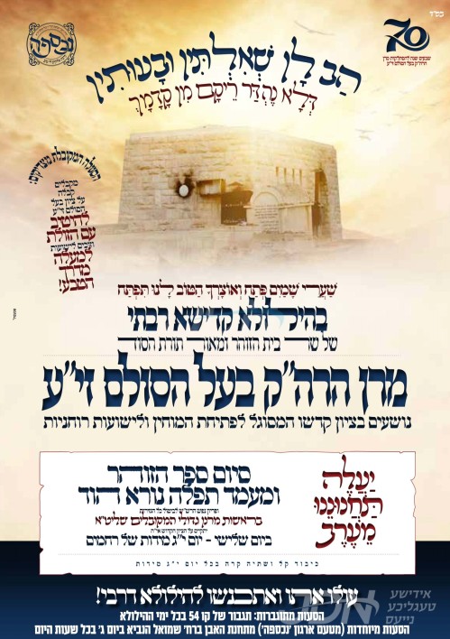כ"ק אדמו"ר מאשלג שליט"א וועט היינט אנקומען צום הר המנוחות אין ירושלים בראש קהל חסידיו, צו פוקד זיין דעם ציון הק' פון זקינו דער הייליגער בעל הסולם זי"ע, לרגל די יומא דהילולא קדישא וואס געפאלט בעצם יום הקדוש.