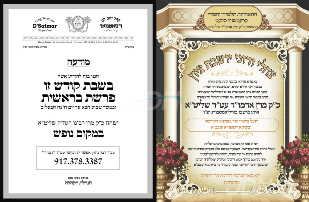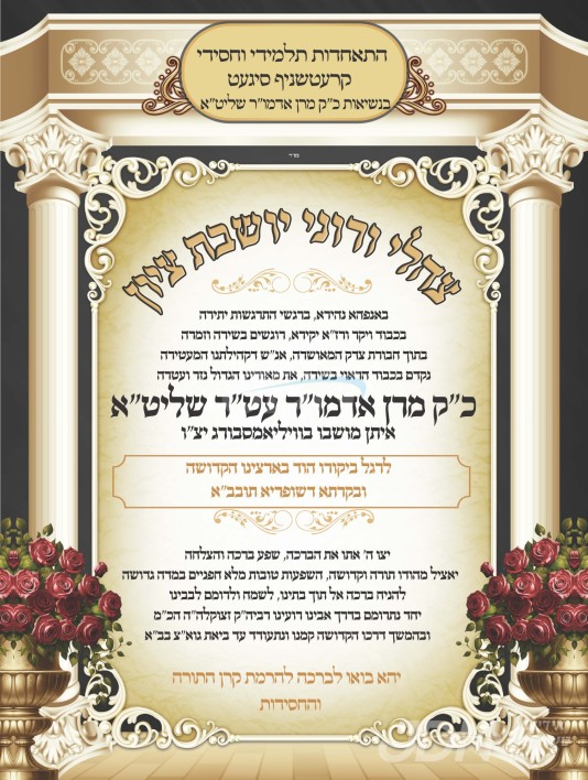 היינט קומט פאר די שמחת הברית פון א אור אייניקל ביי כ"ק אדמו"ר מפאפא שליט"א, אייניקל פון זיין איידעם הגה"צ אבד"ק תולדות אהרן וומס"ב שליט"א, בן הנולד ביי זיין איידעם הרב אלי' לייב מאסקאוויטש שליט"א, זון פון כ"ק אדמו"ר מזלאטשוב וומס"ב שליט"א. – די שמחה קומט פאר אין ביהמ"ד זלאטשוב אין וויליאמסבורג.