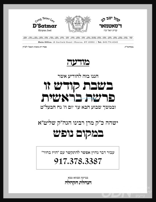 דעם שבת קומט פאר די שמחת האויפרוף פונעם חתן א זון פון הגה"צ ר' שמעון ישראל מייזליש שליט"א, זון פון כ"ק אדמו"ר משאפראן זצ"ל, און איידעם ביי הגה"צ אבד"ק בית אהרן שליט"א, מיט די כלה א טאכטער פון זיין שוואגער הגה"צ ר' אלעזר טייטלבוים שליט"א ראה"כ סאטמאר וומס"ב, זון פון הגה"צ אבד"ק בית אהרן שליט"א, און איידעם ביי כ"ק אדמו"ר מסאטמאר שליט"א. – די שמחת האויפרוף קומט פאר אין ביהמ"ד בית אהרן אין וויליאמסבורג.
