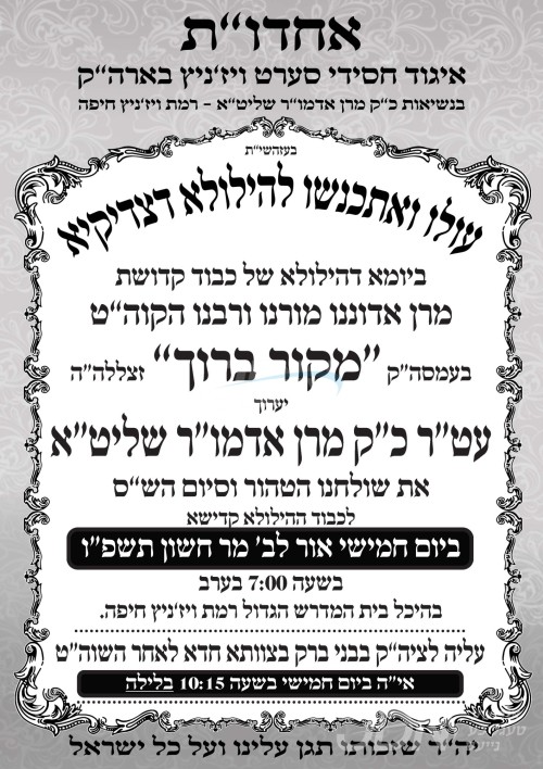 היינט נאכט ב' חשון געפאלט די יומא דהילולא קדישא פון כ"ק אדמו"ר מסערט וויזניץ זצ"ל בעל מקור ברוך, נכדו כ"ק אדמו"ר מסערט וויזניץ שליט"א וועט אפרעכטן די יארצייט טיש היינט אויפדערנאכט אין ביהמ"ד הגדול אין רמת וויזניץ חיפה, און דערנאך ארויספארן קיין בני ברק בראש קהל חסידיו, צו פוקד זיין דעם ציון הק' אויפן וויזניצע בית החיים.