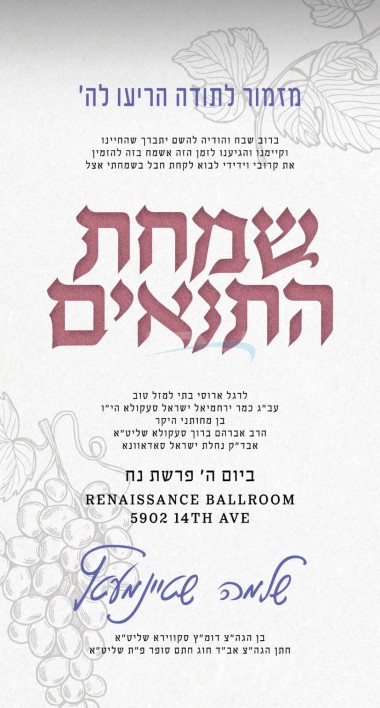 היינט קומט פאר די שמחת התנאים פונעם חתן א זון פון הגה"צ ר' אברהם ברוך סעקולא שליט"א ראש ישיבה גבוה תפארת מנחם אין סטעטן איילענד, זון פון הגה"צ אבד"ק נחלת ישראל סאדאוונא זצ"ל, און איידעם ביי הגה"צ אבד"ק בעסערמין זצ"ל, מיט די כלה א טאכטער פון הרב שלמה שטיינמעטץ שליט"א, זון פון הגה"צ ר' מיכל שטיינמעטץ שליט"א דומ"ץ סקווירא ב"פ ובעל מח"ס משיב נבונים, און איידעם ביי הגה"צ אבד"ק חוג חתם סופר פ"ת שליט"א. – די שמחה קומט פאר אין די רענעסאנס זאל אין בארא פארק.