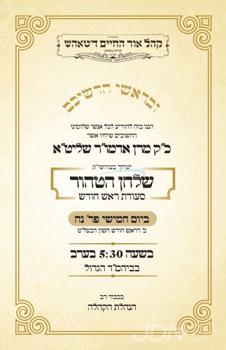 כ"ק אדמו"ר מטאהש שליט"א וועט היינט פארנאכטס אפרעכטן שולחנו הטהור לכבוד ראש חודש, אין ביהמ"ד הגדול אין קרית טאהש.