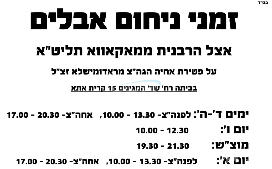 די שוועסטער הרבנית הצדיקת ממאקאווא תליט"א, אשת חבר כ"ק גאב"ד מאקאווא שליט"א, זיצט שבעה אין שטוב פון כ"ק גאב"ד מאקאווא שליט"א אויף רחוב המגינים אין קרית אתא.