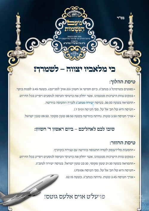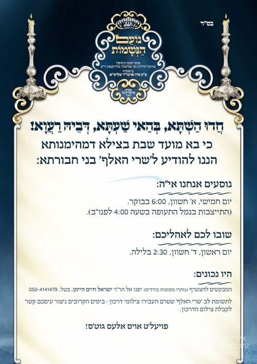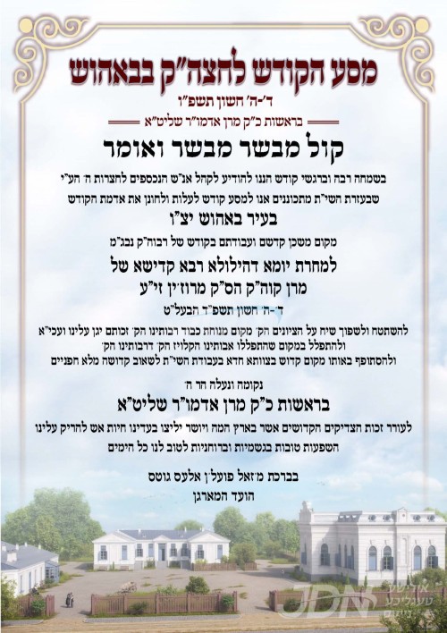כ"ק אדמו"ר מוויזניץ שליט"א פון בית שמש לאזט זיך היינט ארויס אויף א מסע הקודש צו די קברי צדיקים אין פוילין, אינאיינעם מיט פילע חסידים תומכי המוסדות, היינט פארנאכטס וועט דער רבי שליט"א אפרעכטן שולחנו הטהור לכבוד ראש חודש, אינעם נאסטאלגישן בנין פון ישיבת חכמי לובלין אין שטאט לובלין.