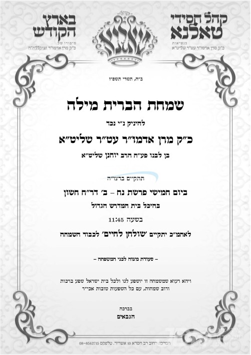 היינט קומט פאר די שמחת הברית פון א אייניקל ביי כ"ק אדמו"ר מטאלנא שליט"א פון אשדוד, איידעם ביי כ"ק אדמו"ר מביאלא פשיסחא אשדוד שליט"א, בן הנולד ביי זיין זון הרב יוחנן טווערסקי שליט"א, איידעם ביי הגה"צ ר' יעקב יוסף שלאף שליט"א, זון פון הגה"צ אבד"ק ביאלאווא לאנדאן שליט"א. – די שמחה קומט פאר אין ביהמ"ד טאלנא אין אשדוד.