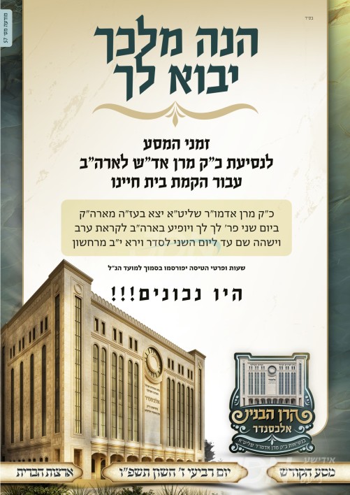 כ"ק אדמו"ר מאלכסנדר שליט"א לאזט זיך היינט ארויס אויף א מסע הקודש קיין אמעריקע, אויפצוטרייבן גרויסע געלטער לטובת די קרן הבנין אויפצובויען דעם נייע ביהמ"ד הגדול דחסידי אלכסנדר אין בני ברק.