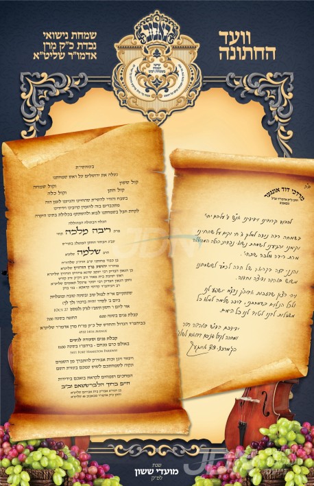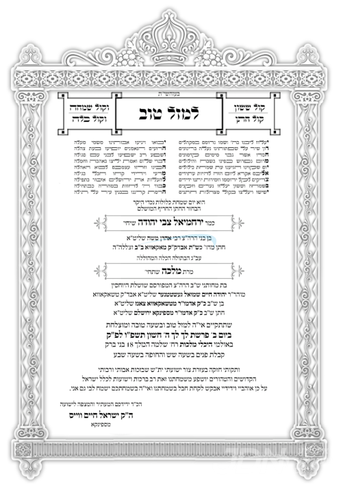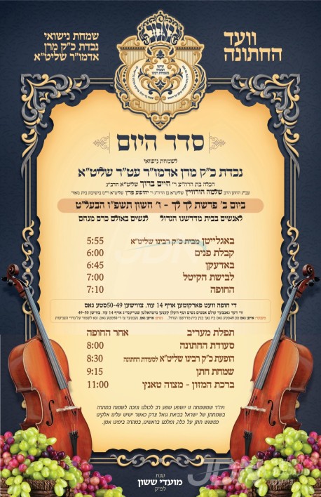 היינט קומט פאר די שמחת החתונה פונעם חתן א זון פון הגה"צ ר' ישראל דוד ניישלאס שליט"א דומ"ץ ברעזנא וראה"כ קארלסבורג, זון פון הגה"צ אבד"ק ברעזנא שליט"א, און איידעם ביי כ"ק אדמו"ר מזימיגראד שליט"א, מיט די כלה א טאכטער פון הגה"צ ר' ישראל דוב סטרולאוויטש שליט"א אב"ד בוטשאטש לעיקוואד, איידעם ביי הגה"צ ר' מענדיל טאגער שליט"א אב"ד לעלוב לאנדאן. – די שמחת החתונה קומט פאר אין זאל כתר משה יהודה אין לעיקוואד.