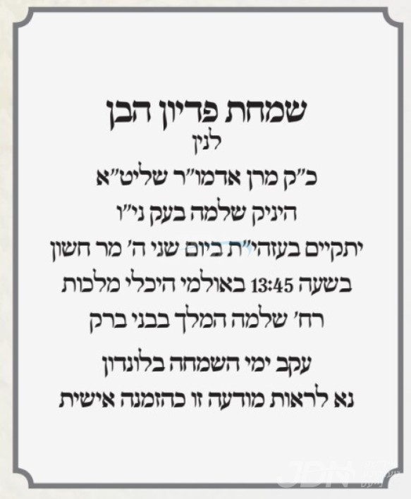 היינט קומט פאר די שמחת הברית פון א אייניקל ביי כ"ק אדמו"ר מנדבורנא באניא שליט"א, בן הנולד ביי זיין איידעם הרב בערל ראזענבוים שליט"א, זון פון כ"ק אדמו"ר מלינסק שליט"א. – די שמחה קומט פאר אין די סאטמארער זאל אויף רחוב יואל אין ירושלים.