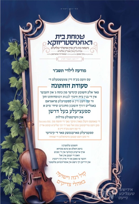 דעם דינסטאג אויפדערנאכט וועט פארקומען די מנהג הקפות און שמחת החתן מאהל אין ביהמ"ד ראחמיסטריווקא, און מיטוואך וירא וועט פארקומען די גרויסע חתונה אינעם זאל פון אטריום פלאזא אין מאנסי, וואס ווערט צוגעשטעלט דורך די חשובע עסקני הקהילה מיט הונדערטער פלעצער פאר כל הקהל הקודש, און א מלכות'דיגער אויבן אן פאר די פילצאליגע אדמורי"ם ורבנים קרובי המשפחה, און די צענדליגע רבני העיר וואס זענען ערווארטעט צו באשיינען די שמחה.