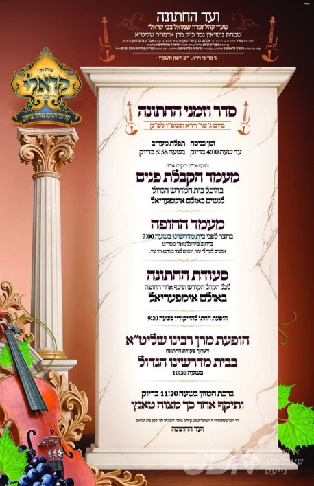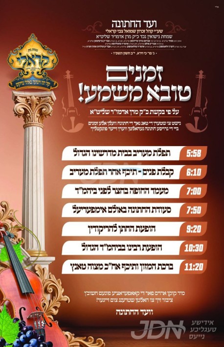 שמחת בית קראלי – ברעזאן – זלאטשוב: היינט קומט פאר די שמחת החתונה פון א אייניקל ביי כ"ק אדמו"ר מקראלי שליט"א, די חתן א זון פון זיין איידעם הגה"צ ר' אברהם ברוך פריעדמאן שליט"א, זון פון הגה"צ אבד"ק ברעזאן שליט"א, זון פון הגה"צ אבד"ק אולם שליט"א, און איידעם ביי הגה"צ אבד"ק זאליזשא שליט"א, מיט די כלה א טאכטער פון הגה"צ ר' ישכר דוב בעריש מאסקאוויטש שליט"א דומ"ץ זלאטשוב וומס"ב, זון פון כ"ק אדמו"ר מזלאטשוב שליט"א, און איידעם ביי הגה"צ אבד"ק תולדות אהרן וומס"ב זצ"ל. – די שמחת החתונה קומט פאר אין ביהמ"ד קראלי און אינעם אימפעריאל זאל אין וויליאמסבורג.