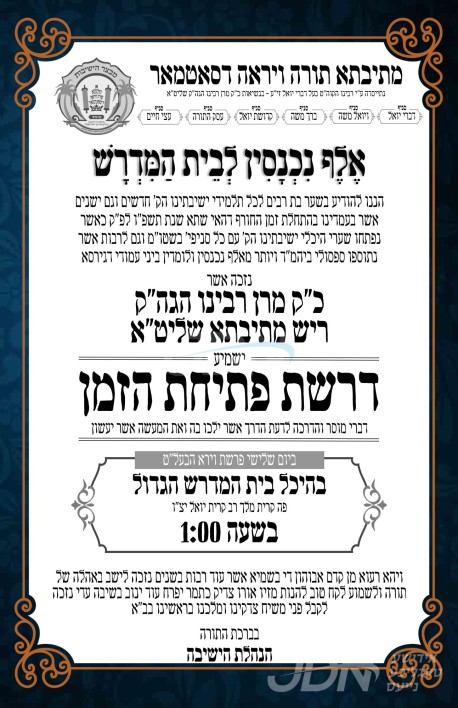 כ"ק אדמו"ר מסאטמאר שליט"א וועט היינט מיטאג אויפטרעטן מיט די צענטראלע דרשת פתיחת הזמן, פאר די הונדערטער תלמידי הישיבות פון אלע סניפים, אין ביהמ"ד הגדול אין קרית יואל.