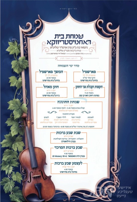 שמחת בית ראחמיסטריווקא: היינט קומט פאר די שמחת חתן מאהל פון די כלה א טאכטער ביי כ"ק אדמו"ר מראחמיסטריווקא שליט"א פון ספרינג וואלי, איידעם ביי הגה"צ אבד"ק ראחמיסטריווקא מאנסי שליט"א, מיט די חתן א זון פון זיין פעטער הגה"צ ר' שמואל דוד שניאורסאן שליט"א משגיח ישיבת טשעבין, זון פון הגה"צ ראש ישיבת טשעבין שליט"א, און איידעם ביי הגה"צ ר' וועלוויל טווערסקי זצ"ל מראחמיסטריווקא. – די שמחת חתן מאהל קומט פאר אין ביהמ"ד ראחמיסטריווקא אין מאנסי.