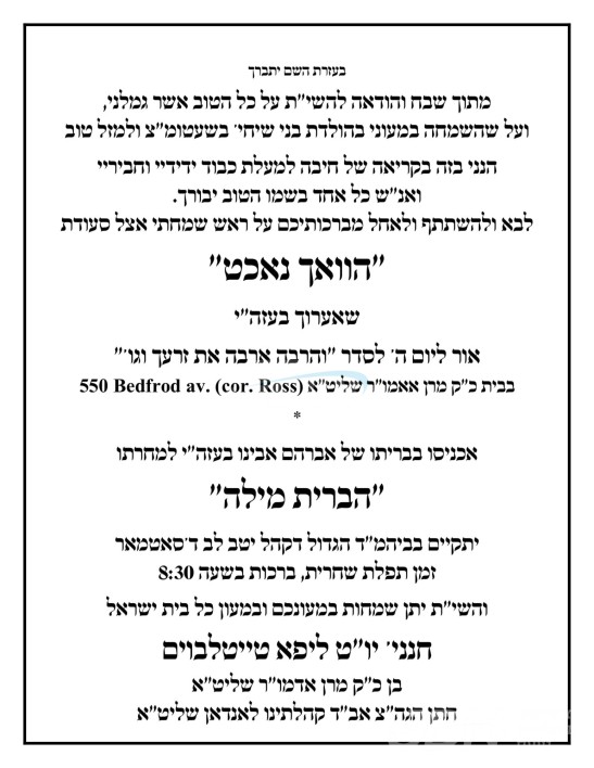 היינט קומט פאר די שמחת הברית פון א אייניקל ביי כ"ק אדמו"ר מסאטמאר שליט"א, בן הנולד ביי זיין זון הגה"צ ר' חנני' יו"ט ליפא טייטלבוים שליט"א, איידעם ביי הגה"צ ר' ברוך נתן האלבערשטאם שליט"א אבד"ק סאטמאר לאנדאן. – די שמחה קומט פאר אין ביהמ"ד הגדול דקהל יטב לב ד'סאטמאר אין וויליאמסבורג.