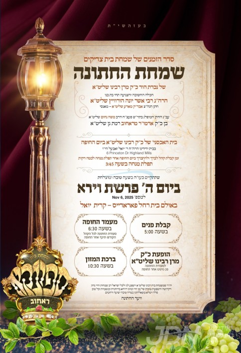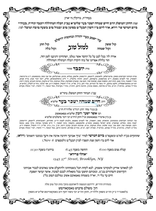 היינט קומט פאר די שמחת החתונה פונעם חתן א זון פון הגה"צ ר' אשר ישעי' רובין שליט"א מטאמאשוב, איידעם ביי הגה"צ ר' ירמי' טייטלבוים שליט"א, מיט די כלה א טאכטער פון הגה"צ ר' משולם פייוויש מאסקאוויטש שליט"א משאץ, זון פון כ"ק אדמו"ר משאץ מאנטריאל זצ"ל, און איידעם ביי הגה"צ ר' משה יוסף מאסקאוויטש שליט"א משאץ ב"פ. – די שמחת החתונה קומט פאר אין זאל אהלי פרידא אין בארא פארק.