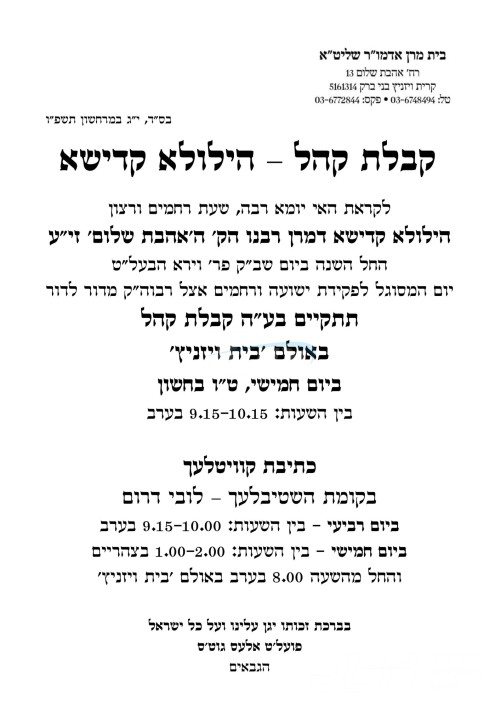 לקראת די יומא דהילולא קדישא פון הרה"ק בעל אהבת שלום מקאסוב זי"ע, וועט כ"ק אדמו"ר מוויזניץ שליט"א לרפו"ש אויפנעמען די חסידים היינט מיט קוויטלעך כנהוג, אין זאל פון בית וויזניץ בבנין ביהמ"ד הגדול אין קרית וויזניץ בני ברק. אזוי אויך וועט דער רבי שליט"א פראווענען דעם שבת ברוב עם אין ביהמ"ד הגדול אין קרית וויזניץ, לרגל די יומא דהילולא קדישא.