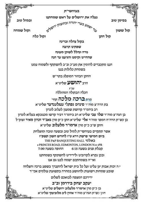 שמחת בית לעלוב: היינט קומט פאר די שמחת החתונה פון א אייניקל ביי כ"ק אדמו"ר מלעלוב שליט"א, די כלה א טאכטער פון זיין איידעם הרב פנחס נפתלי ענגלענדער שליט"א, זון פון הגה"צ ר' שלום צבי ענגלענדער שליט"א ראה"כ להוראה דחסידי מאחנובקא בעלזא לאנדאן, זון פון הנגיד החסיד ר' אלי'ש ענגלענדער שליט"א, און איידעם ביי הגה"צ גאב"ד זכרון מאיר זצ"ל, מיט די חתן א זון פון הרב יעקב יצחק בידערמאן שליט"א, זון פון כ"ק אדמו"ר מלעלוב ירושלים שליט"א, און איידעם ביי הגה"צ ר' אהרן לייב מאלבוצקי שליט"א מלעכאוויטש. – די שמחת החתונה קומט פאר אין זאל P&P אין לאנדאן.