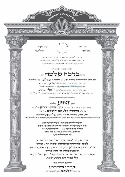 היינט קומט פאר די שמחת החתונה פונעם חתן א זון פון הגה"צ ר' יהושע אשר ווייסבלום שליט"א אב"ד סערצין, זון פון כ"ק אדמו"ר משעניצא זצ"ל, און איידעם ביי הגה"צ ר' יעקב קופפערמאן זצ"ל, מיט די כלה א טאכטער פון הגה"צ ר' משה יוסף אונגער שליט"א אבד"ק ווייטצען שיקאגא, זון פון כ"ק אדמו"ר מדאמבראווא זצ"ל, און איידעם ביי הגה"ק מווייטצען זצ"ל בעל בנין צבי. – די שמחת החתונה קומט פאר אין זאל עטרת אילה אין שיקאגא.