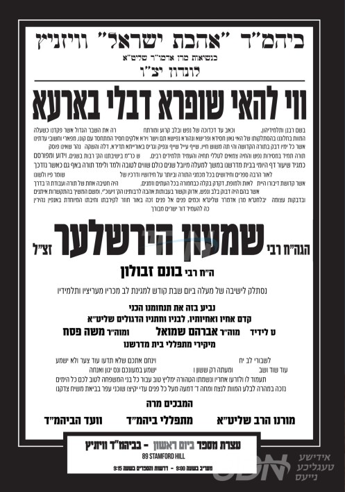 היינט קומט פאר אן עצרת הספד והתעוררות אין ביהמ"ד אהבת ישראל דחסידי וויזניץ אין לאנדאן, ככלות השבעה צו די פטירה פון הרה"ג ר' שמעון הירשלער זצ"ל לאנגיעריגער מרביץ תורה אין ביהמ"ד איבער א יובל יארן.