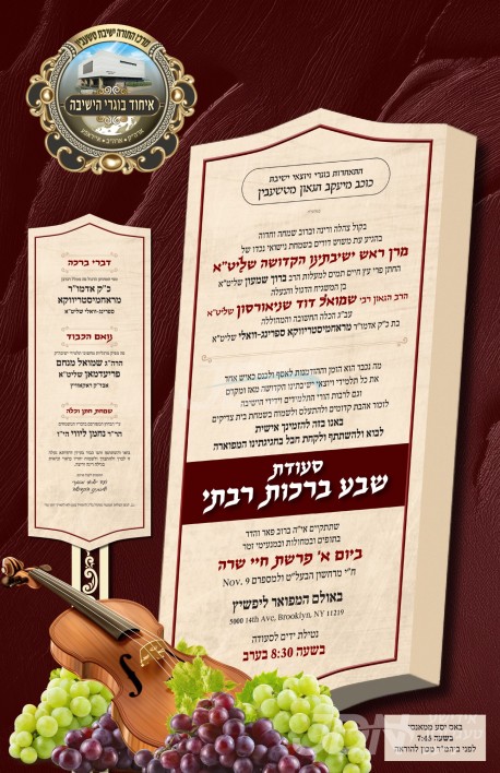 שמחת בית ראחמיסטריווקא – טשעבין: היינט קומט פאר די שמחת השבע ברכות פונעם חתן א זון פון הגה"צ ר' שמואל דוד שניאורסאן שליט"א משגיח ישיבת טשעבין, זון פון הגה"צ ראש ישיבת טשעבין שליט"א, און איידעם ביי הגה"צ ר' וועלוויל טווערסקי זצ"ל מראחמיסטריווקא, מיט די כלה א טאכטער פון כ"ק אדמו"ר מראחמיסטריווקא שליט"א פון ספרינג וואלי, איידעם ביי הגה"צ אבד"ק ראחמיסטריווקא מאנסי שליט"א. – די שמחת השבע ברכות קומט פאר אין די ליפשיץ זאל אין בארא פארק, צוגעשטעלט דורך איחוד בוגרי ישיבת טשעבין.