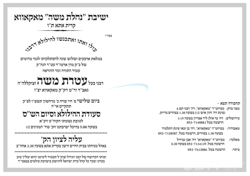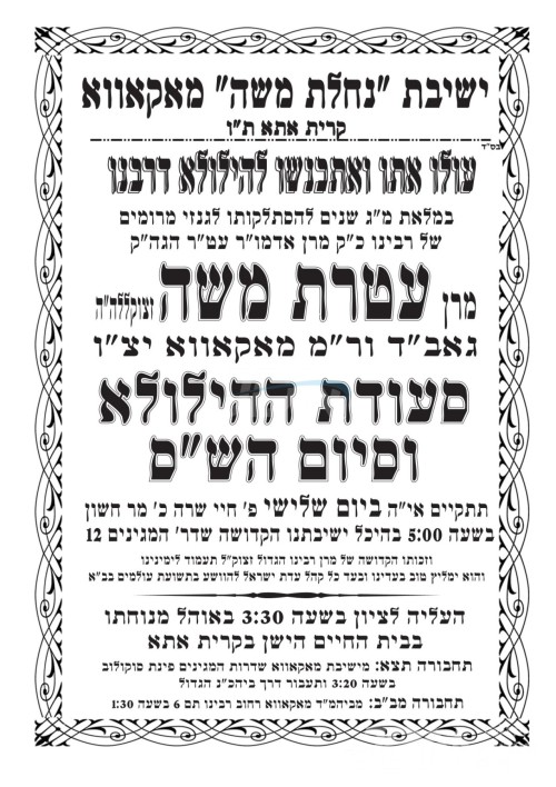 היינט כ' חשון געפאלט די יומא דהילולא קדישא פון הרה"ק בעל עטרת משה ממאקאווא זי"ע, בנו ממלא מקומו כ"ק גאב"ד מאקאווא שליט"א וועט ארויפגיין צום ציון הק' בראש קהל חסידיו אויפן בית החיים אין קרית אתא, און שפעטער פארנאכטס אפרעכטן די יארצייט טיש בהיכל ישיבת מאקאווא אין קרית אתא.