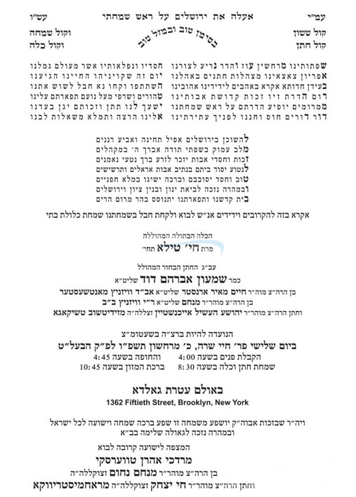 היינט קומט פאר די שמחת החתונה פונעם חתן א זון פון הרב חיים יעקב סאפרין שליט"א, זון פון כ"ק אדמו"ר מקאמארנא ב"ב שליט"א, און איידעם ביי כ"ק אדמו"ר ממישקאלץ פ"ת שליט"א, מיט די כלה א טאכטער פון הרב ברוך זאלמענאוויטש שליט"א, זון פון הגה"צ ר' אליהו זאלמענאוויטש זצ"ל ראה"כ גארליץ, און איידעם ביי כ"ק אדמו"ר מספינקא סוליצא שליט"א. – די שמחת החתונה קומט פאר אין זאל היכלי מלכות אין בני ברק.