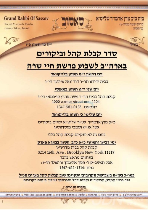 כ"ק אדמו"ר מסאסוב שליט"א וועלכער איז צוגאסט די טעג אין ניו יארק לטובת מוסדותיו הקדושים, וועט היינט אנקומען קיין בארא פארק, און אויפנעמען דעם ציבור חסידים בבית מדרשו אויף די זעכצנטע עוועניו.