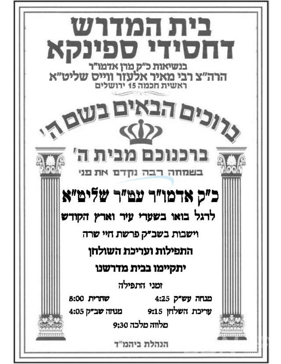 כ"ק אדמו"ר מספינקא שליט"א וועלכער איז צוגאסט די טעג אין ארץ ישראל בקרב חסידיו, וועט פראווענען דעם שבת בבית מדרשו אויף רחוב ראשית חכמה אין ירושלים.