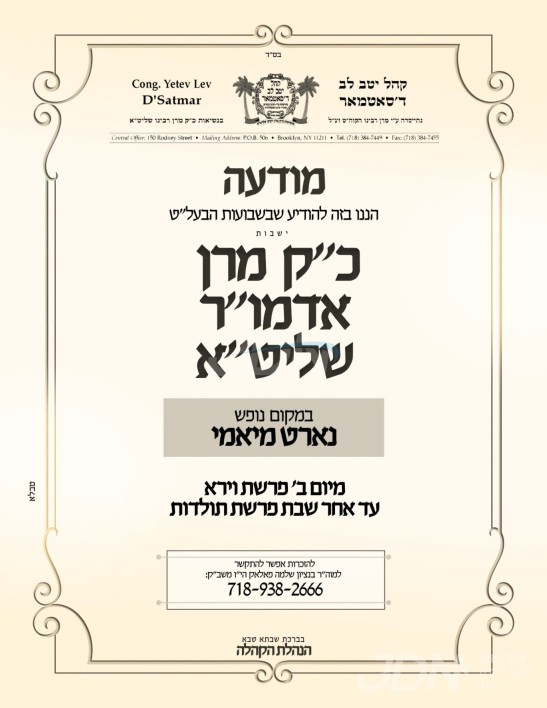 כ"ק אדמו"ר מסאטמאר שליט"א וויילט דעם שבת אין נארט מיאמי פלארידע אויף אפרוה.
