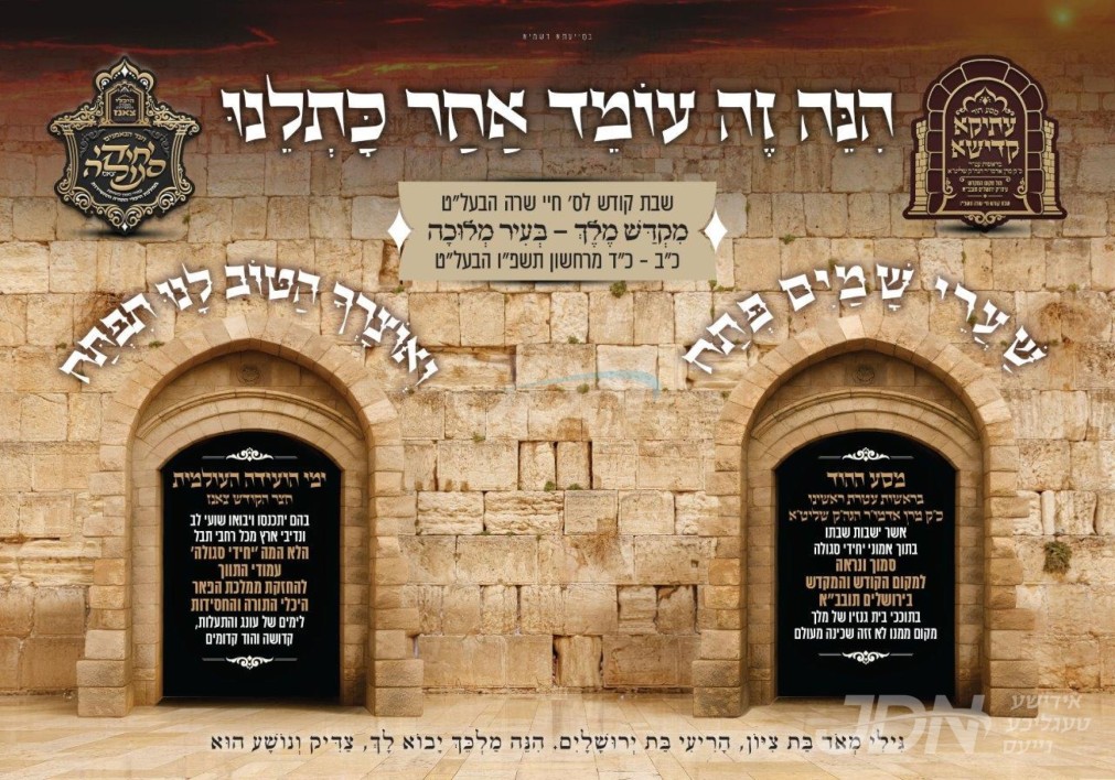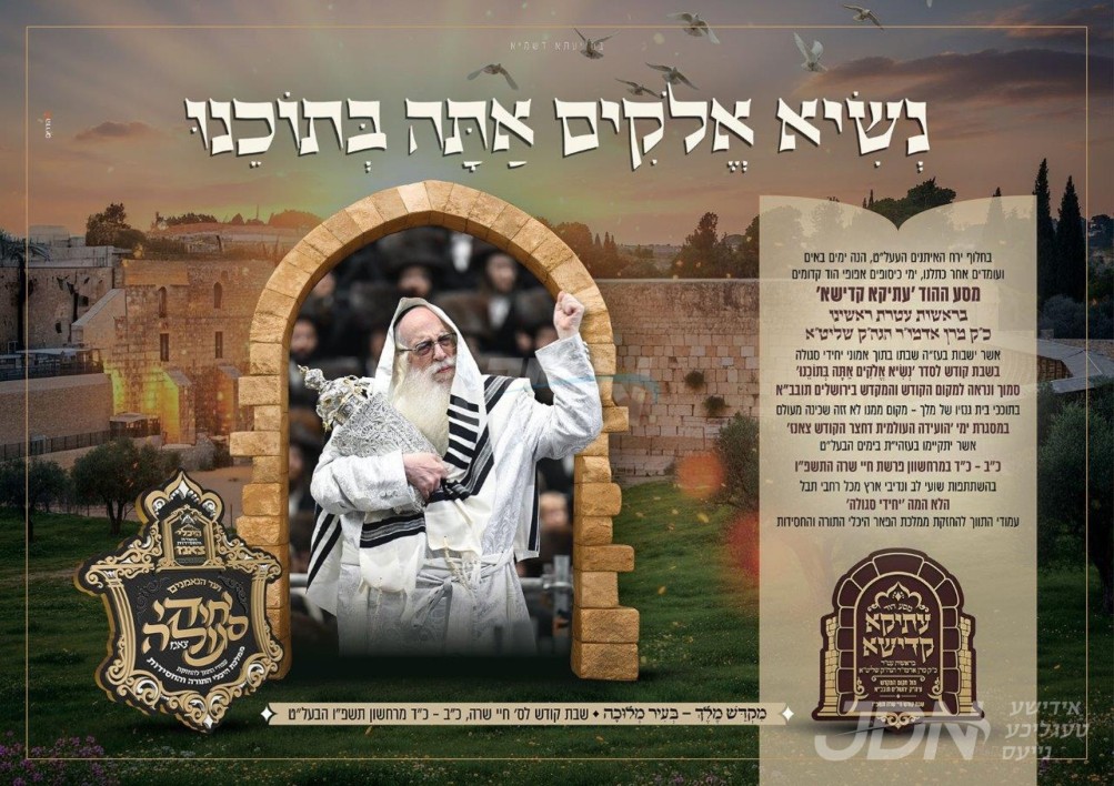כ"ק אדמו"ר מדזיקוב וויזניץ ב"פ שליט"א איז צוגאסט אויף שבת אין ירושלים, די תפילות און טישן קומען פאר אין ביהמ"ד קהל תורת חיים וויזניץ אויף רחוב אדוניהו.