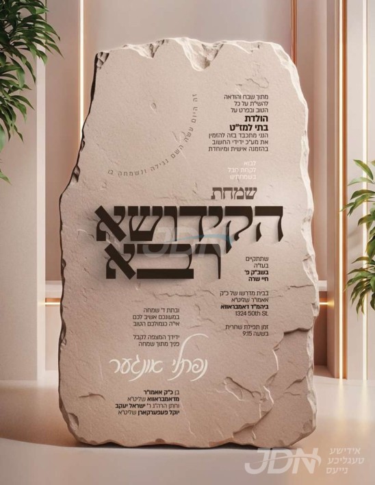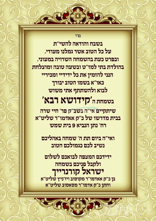 דעם שבת קומט פאר די שמחת הקידושא רבא פון א אייניקל ביי כ"ק אדמו"ר מקוסוב וויזניץ שליט"א, א מיידל ביי זיין זון הרב ישראל קארנרייך שליט"א, איידעם ביי כ"ק אדמו"ר מסאסוב שליט"א. – די שמחה קומט פאר אין ביהמ"ד קוסוב וויזניץ אין בית שמש.