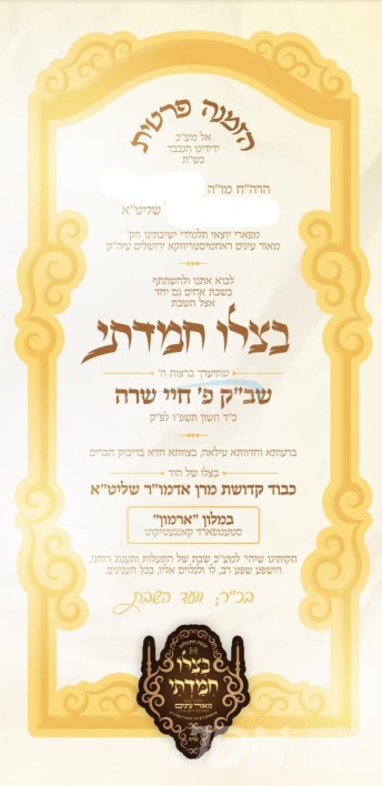 שמחת בית ראחמיסטריווקא: דעם שבת קומט פאר די שמחת השבע ברכות פונעם חתן א זון פון הגה"צ ר' חיים מאיר ארנסטר שליט"א אבד"ק וויזניץ מאנטשעסטער, זון פון הגה"צ ר' מנחם ארנסטר שליט"א ראש ישיבת וויזניץ, און איידעם ביי כ"ק אדמו"ר מזידטשויב שיקאגא זצ"ל, מיט די כלה א טאכטער פון הגה"צ ר' מרדכי אהרן טווערסקי שליט"א, יונגסטע איידעם פון כ"ק אדמו"ר מראחמיסטריווקא זצ"ל. – די שמחת השבע ברכות קומט פאר אין ביהמ"ד הגדול ראחמיסטריווקא אין בארא פארק.