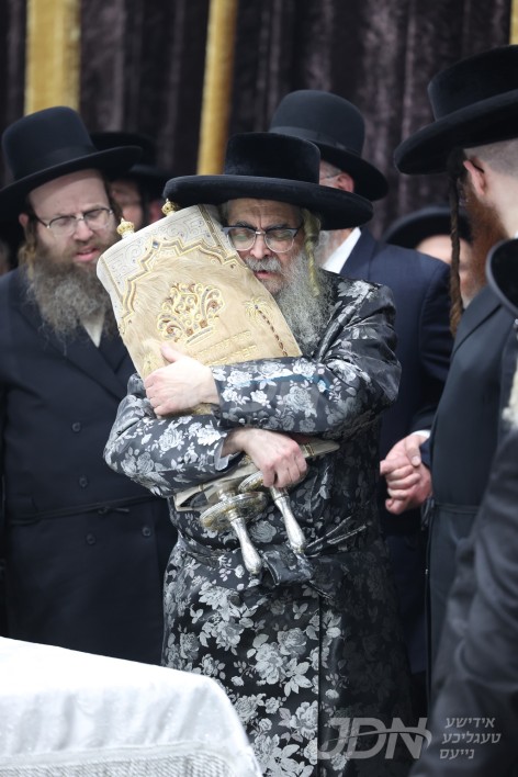 דער רבי האט זיך באגריסט מיט די רבנים אויפן אויבן אן, און מען האט פאר לענגערע מינוטן געטאנצן אויף די הויכשטאקיגע פארענטשעס. דער רבי שליט"א האט אויפגעטרעטן מיט רירנדע דברות קודש בצפיה לגאולה, און דערנאך האט דער רבי אריינגעשריבן די לעצטע אותיות אינעם ספר תורה, און זיך אויפגעשטעלט אויף א פייערדיגן ריקוד מיטן ספר תורה.