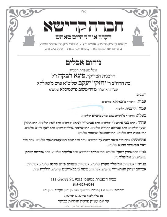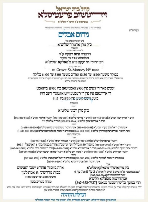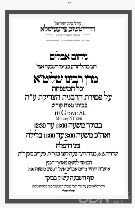 צו די פטירה פון הרבנית הצדיקת מזידטשויב פרעמיסלא ע"ה, זיצן שבעה די בני המשפחה אין איר שטוב אויף גראוו סטריט אין מאנסי, בעלה הגדול כ"ק אדמו"ר מזידטשויב פרעמיסלא שליט"א און זיינע קינדער, איר פאטער הגה"צ ר' יחזקי' יעקב פיש שליט"א אבד"ק סאלקא און זיינע קינדער.