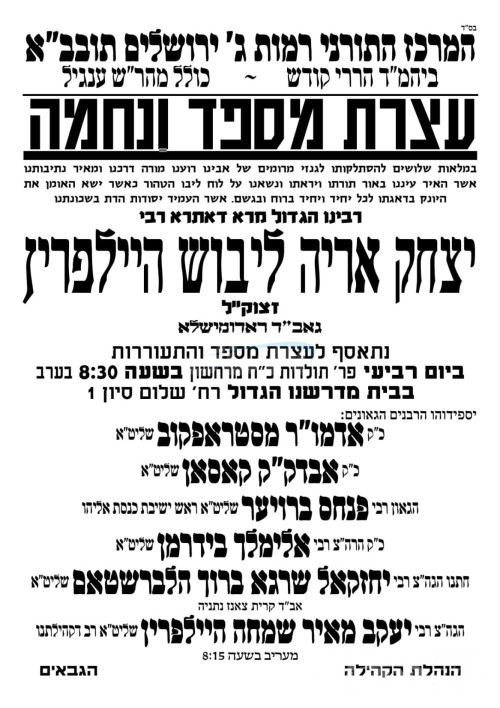 ככלות השלושים צו די פטירה פון הגה"צ גאב"ד ראדאמישלא רמות זצ"ל, קומט היינט פאר אן עצרת מספד ונחמה בבית מדרשו אין די רמות ג' געגנט אין ירושלים, וואו עס וועלן אויפטרעטן די מחותנים כ"ק האדמורי"ם מסטראפקוב און קאסאני בית שמש שליט"א, הגה"צ המשפיע ר' אלימלך בידערמאן שליט"א, הגאון ר' פנחס ברויער שליט"א ר"י כנסת אליהו, חתנו הגה"צ אב"ד קרית צאנז נתני' שליט"א, און בנו ממלא מקומו הגה"צ גאב"ד ראדאמישלא רמות שליט"א.