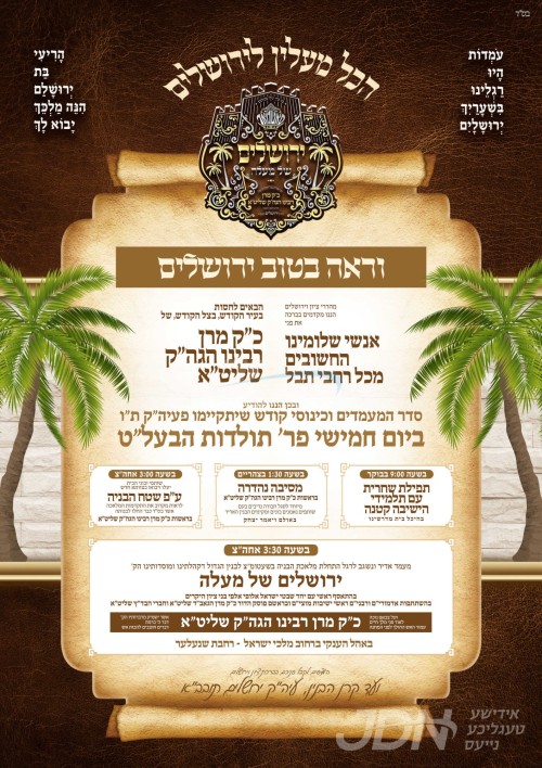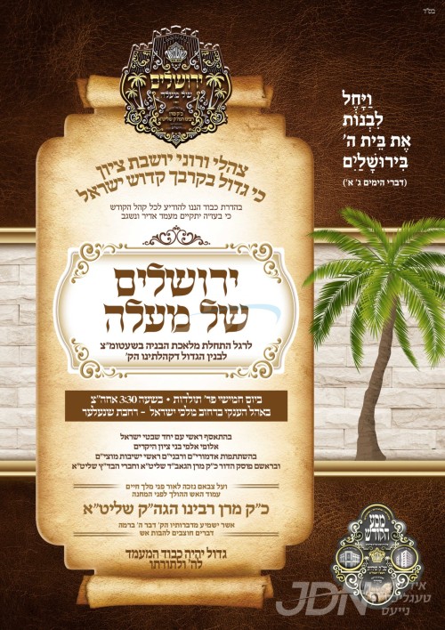 היינט קומט פאר די גרויסארטיגע מעמד ירושלים של מעלה, צום אויפבוי פון די גיגאנטישע בנין המוסדות דחסידי סאטמאר ירושלים, אין שפיץ פון כ"ק אדמו"ר מסאטמאר שליט"א און די שרי התורה חברי ביד"ץ החדה החרדית, אינעם ריזן שאטער אויף מתחם שנעלער אין ירושלים עיה"ק.