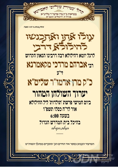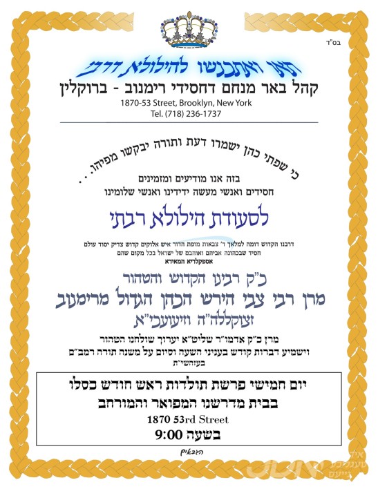לרגל די הילולא קדישא פון הרה"ק דער רבי ר' הערש פון רימנוב זי"ע, וועט כ"ק אדמו"ר מרימנוב שליט"א אפרעכטן די יארצייט טיש בבית מדרשו אין בארא פארק היינט אויפדערנאכט.
