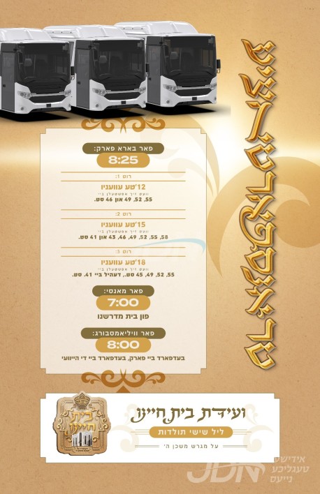 כ"ק אדמו"ר מוויזניץ שליט"א פון בית שמש לאזט זיך היינט ארויס אויפן וועג קיין לאנדאן, וואו דער רבי וועט זיך אויפהאלטן די קומענדיגע וואך לטובת מוסדותיו הקדושים, די אכסניא איז אין שטוב פון הנגיד החסיד ר' יוסף ארי' פעלדמאן הי"ו.