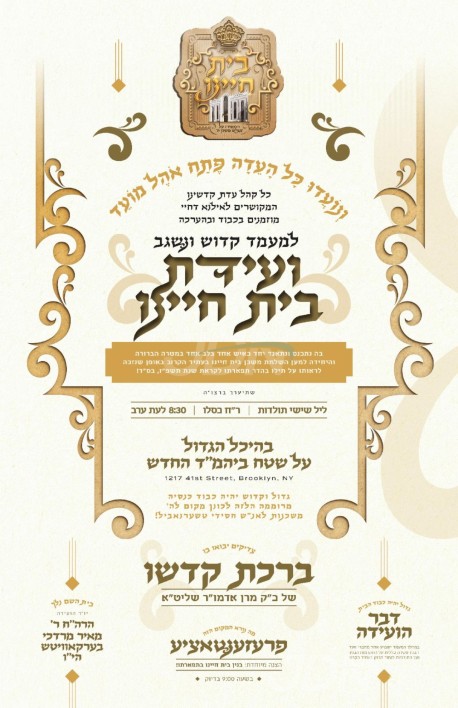 היינט קומט פאר די מעמד ועידת בית חיינו לטובת די קרן הבנין פון ביהמ"ד החדש טשערנאביל אין בארא פארק, אינעם גרויסן היכל אויפן שטח הבניה, אין שפיץ פון כ"ק אדמו"ר מטשערנאביל שליט"א.