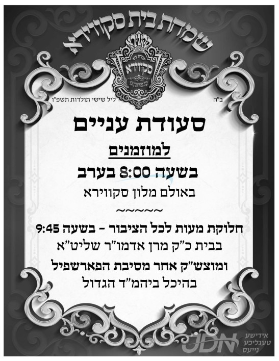 היינט קומט פאר די סעודת עניים לקראת די שמחת החתונה פון די כלה יונגסטע קינד ביי הגה"צ ר' יצחק טווערסקי שליט"א, זון פון כ"ק אדמו"ר מסקווירא שליט"א, און איידעם ביי כ"ק אדמו"ר מוויזניץ שליט"א, מיט די חתן א זון פון הרב דוד גראס שליט"א ראה"כ סקווירא בני ברק. די שמחה קומט פאר אין זאל פון מלון אין שיכון סקווירא.